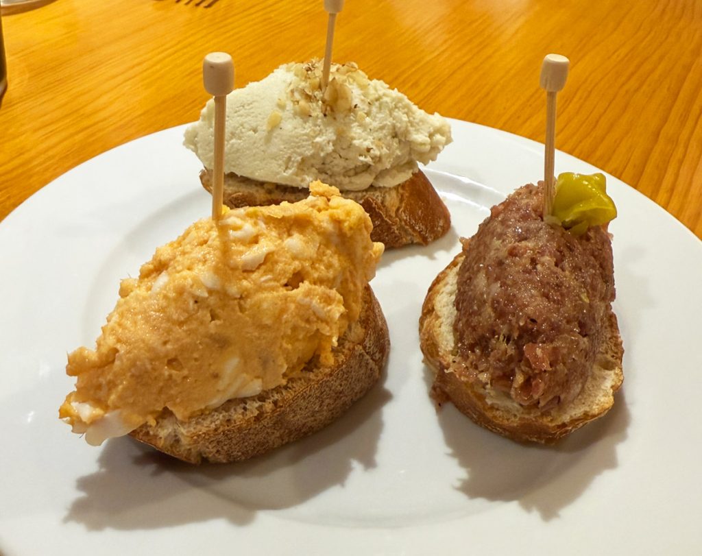 Nosotros probamos el de crema de queso gorgonzola y nueves, el de pastel de cabracho y uno sus pinchos fríos más aclamados: el tartar de fuet, una auténtica delicia que reinventa este embutido con un toque gourmet. Su presentación cuidada y su sabor sorprendente lo convierten en una opción obligatoria.